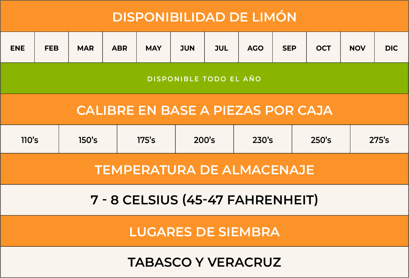 Producto firme, con tamaño uniforme, jugoso y con tonalidad verde característica, se evita la presencia de los defectos comunes como: pudrición, mancha de aceite, blanching y cicatriz.